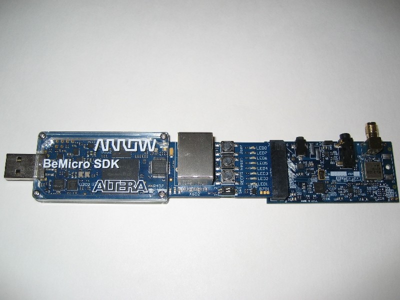 SDRstick™ HF1 is a small, low-power consumption Software Defined Receiver built in a narrow strip or "stick" form-factor. Utilizing an onboard LTC2249 14-bit @ 80MSPS Analog to Digital Convertor, 17.5dB LNA, 30MHz LPF and 12-bit@ 48KSPS audio DAC with headphone output, the UDPSDR-HF1 with the BeMicro SDK FPGA development board, firmware load and an appropriate software package make a complete Digital Down Conversion HF receiver for 100KHz to 30MHz. The external antenna RF input is via an SMA connector. Board power is supplied by the USB port of the BeMicro SDK.